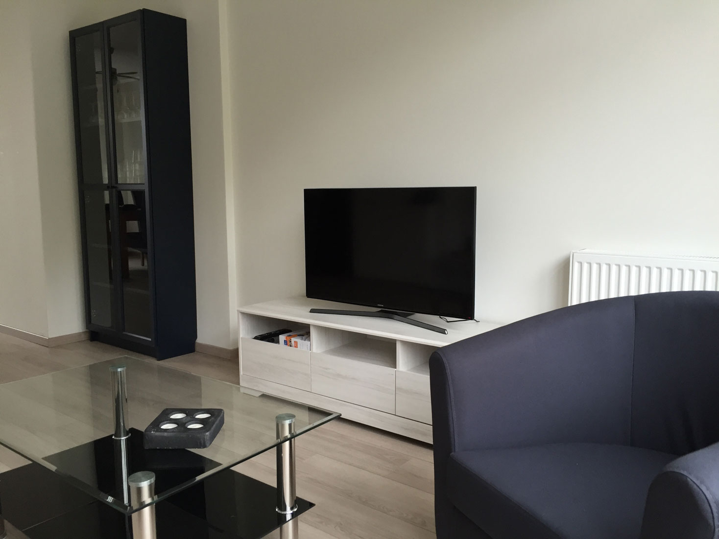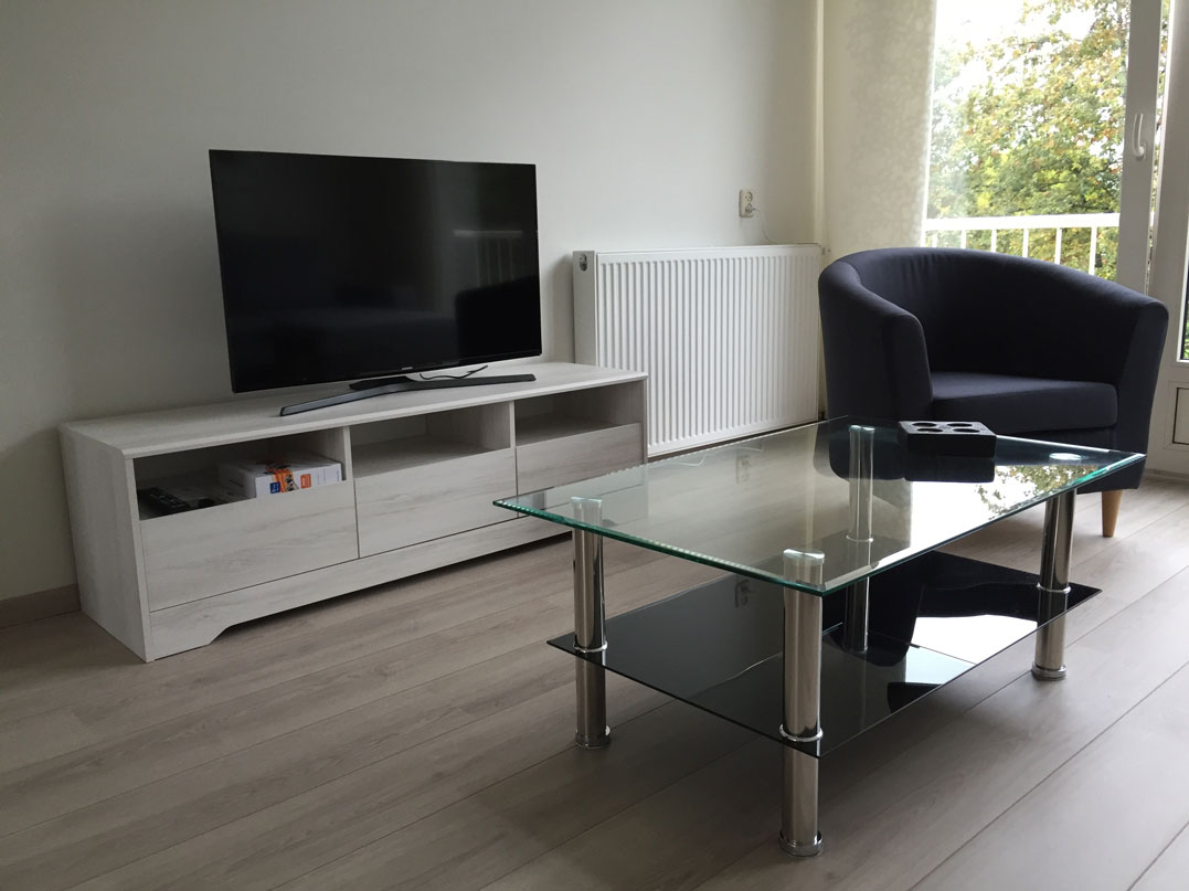The large sunny living room has a beautiful 'French balcony' on the front side. The room is very light due to big windows at both the front side and the back side. On the front side a nice view into a green park may give you the impression of living in the countryside. The dining table in the back of the living room can be enlarged.